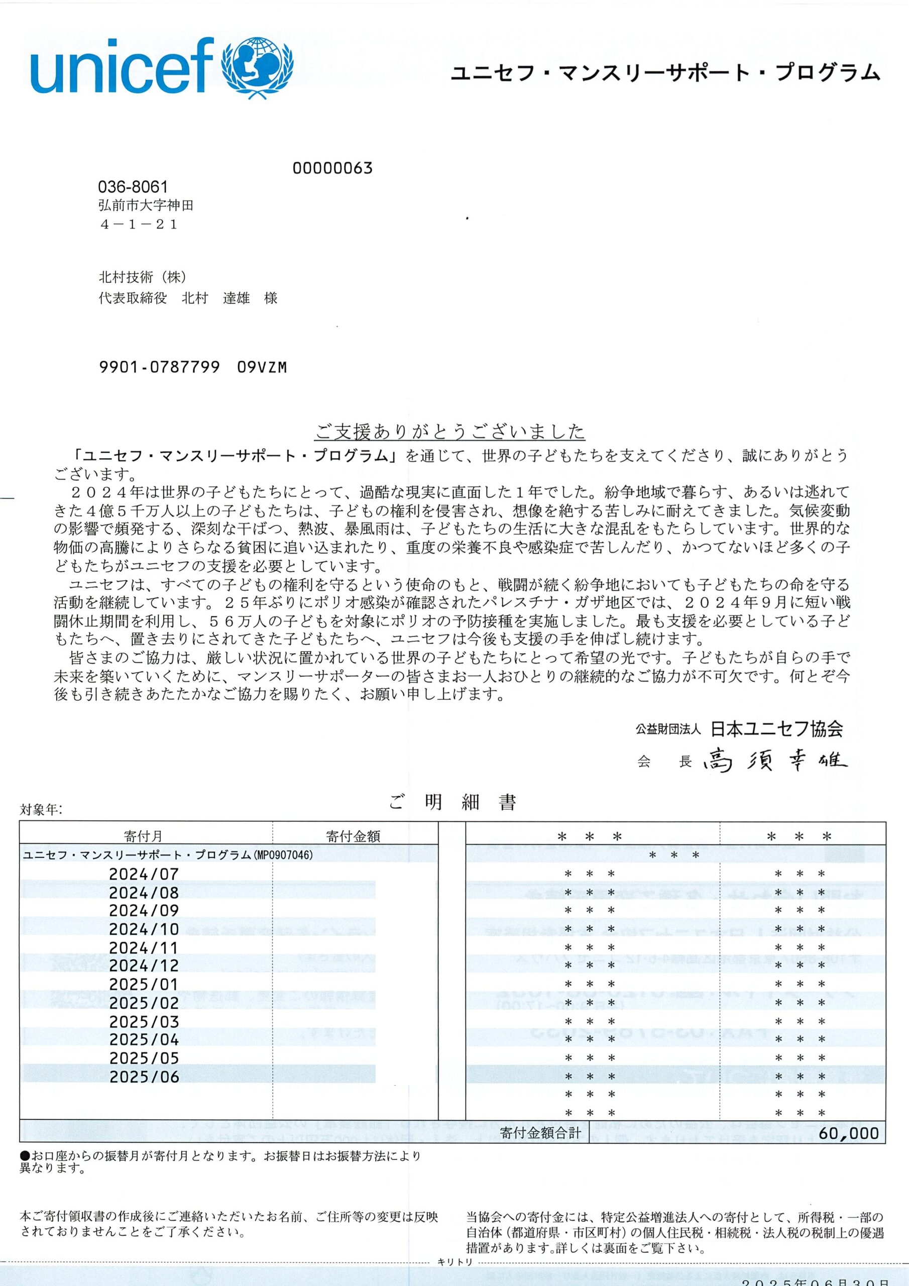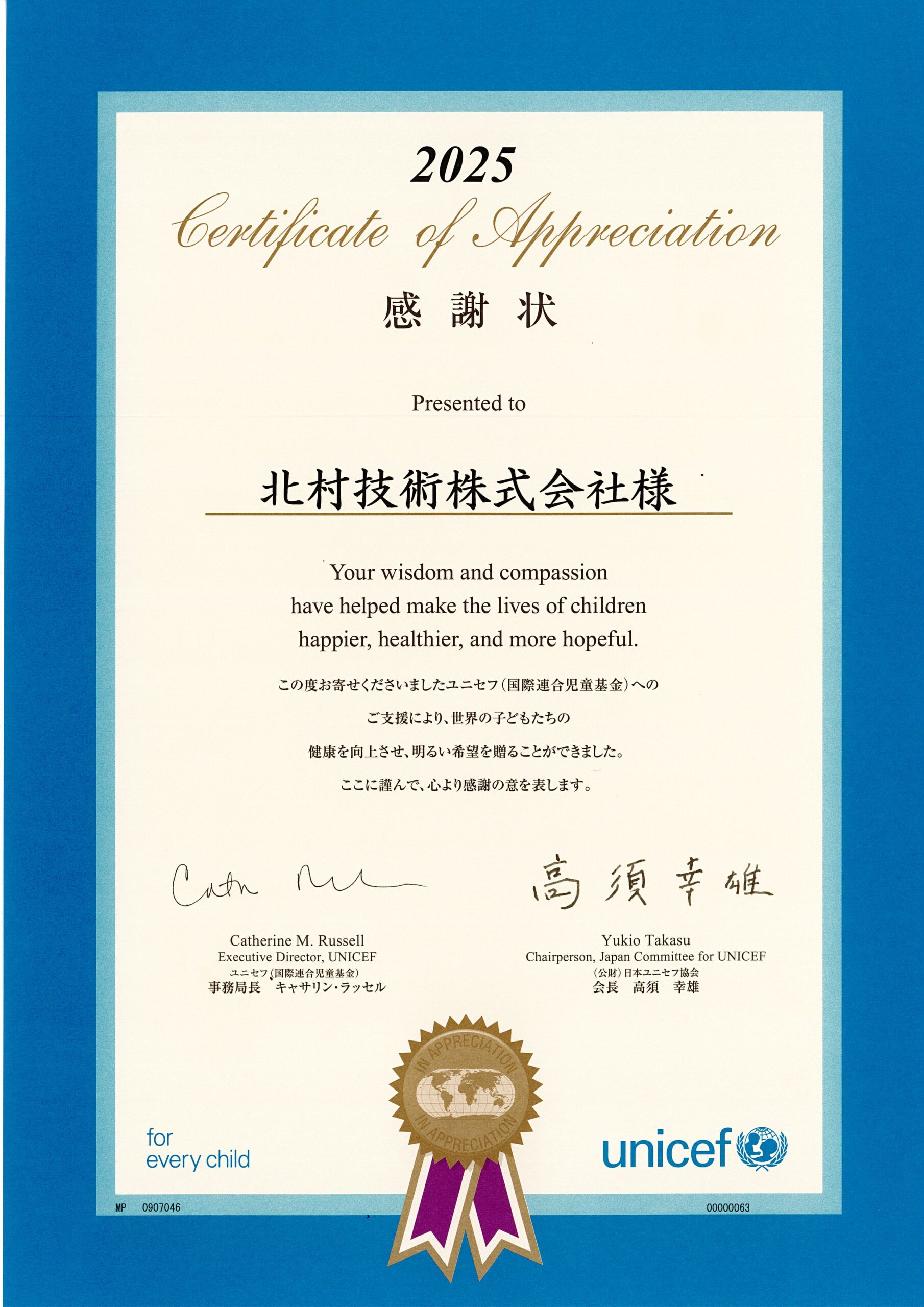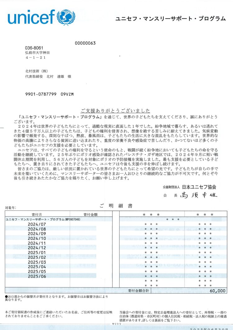 北村技術ではユニセフ様に定期的な寄付を行っております