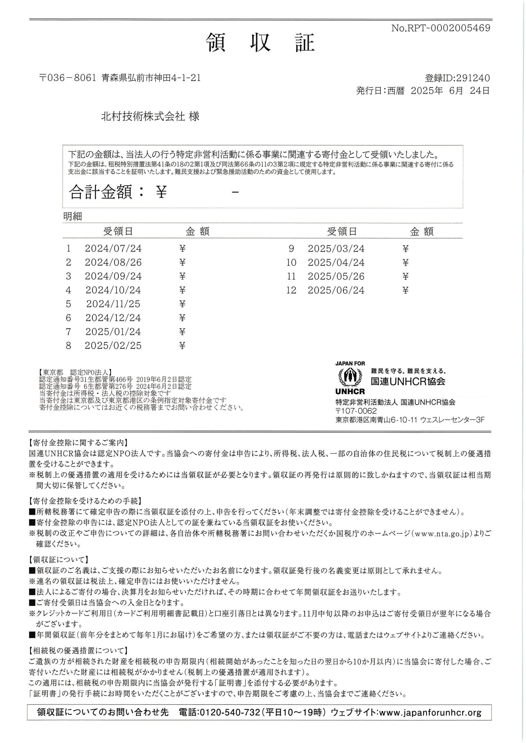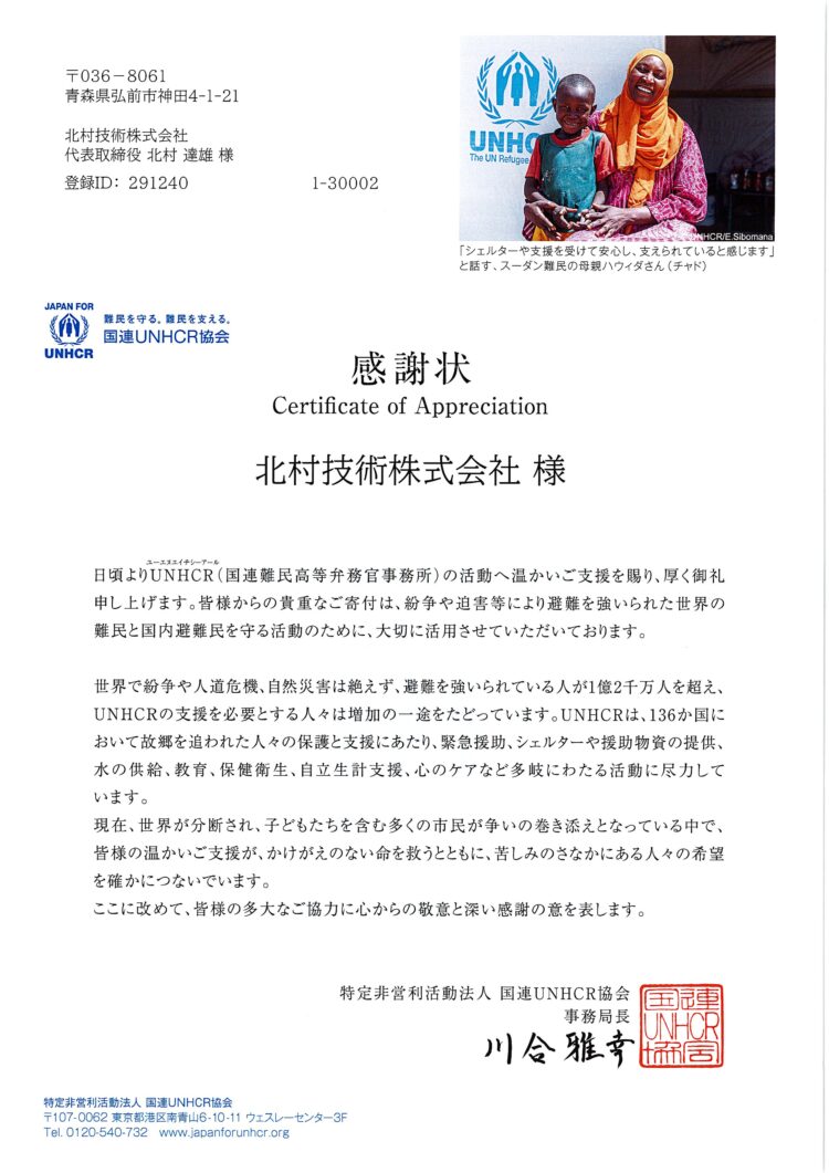 北村技術ではUNHCR様に定期的な寄付を行っております