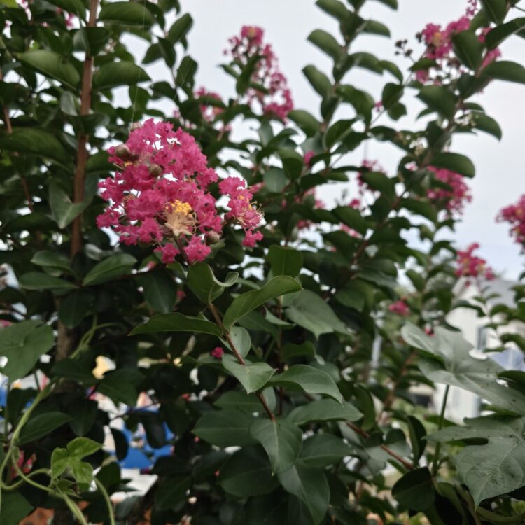 赤い花の真ん中が黄色くなるさるすべりの花
