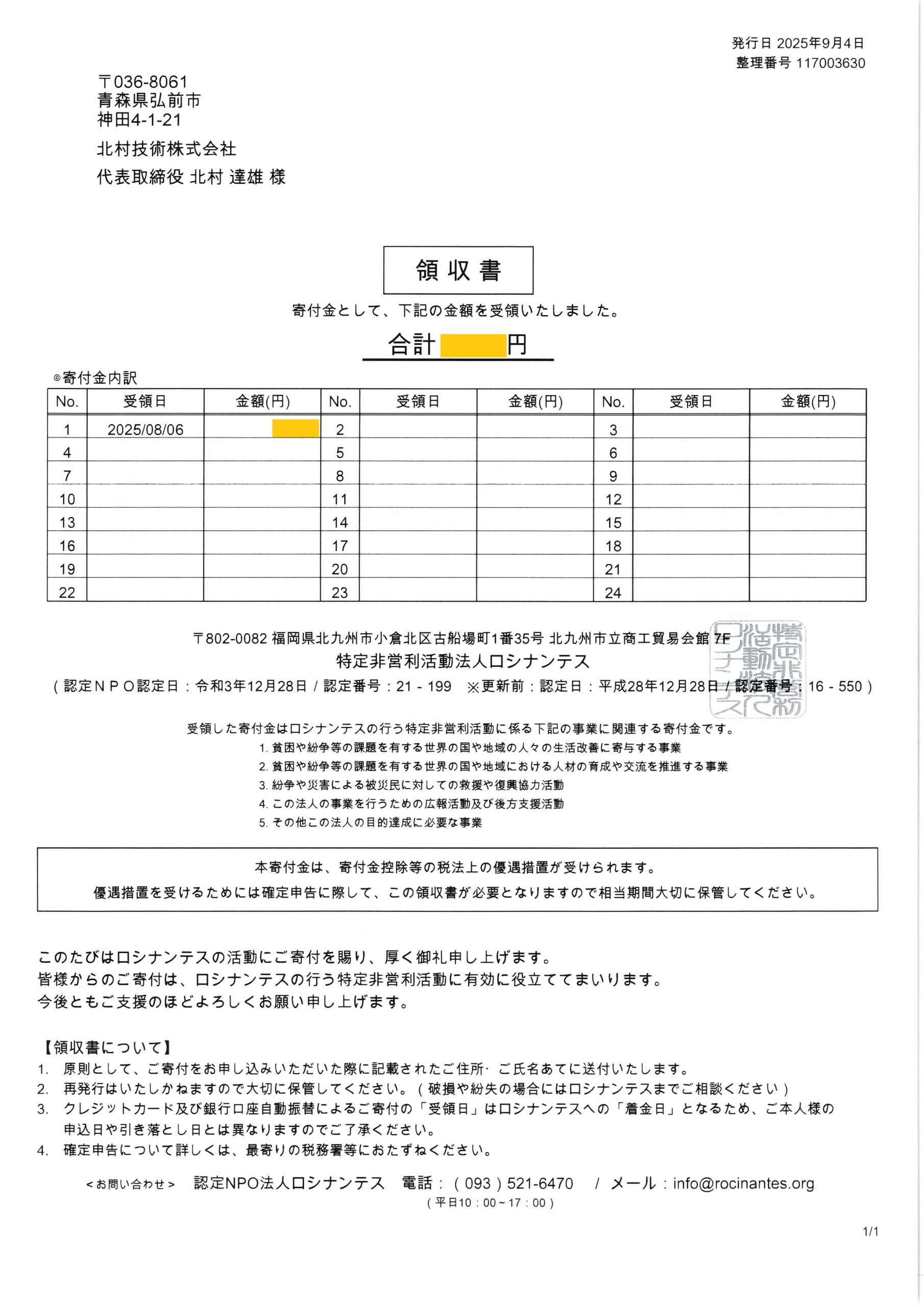 北村技術ではロシナンテス様に定期的な寄付を行っております