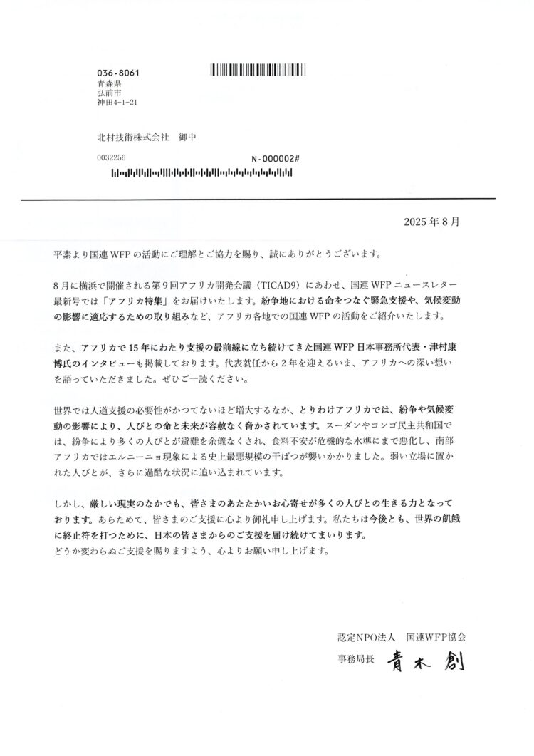 北村技術では国連WFP様に定期的な寄付を行っております