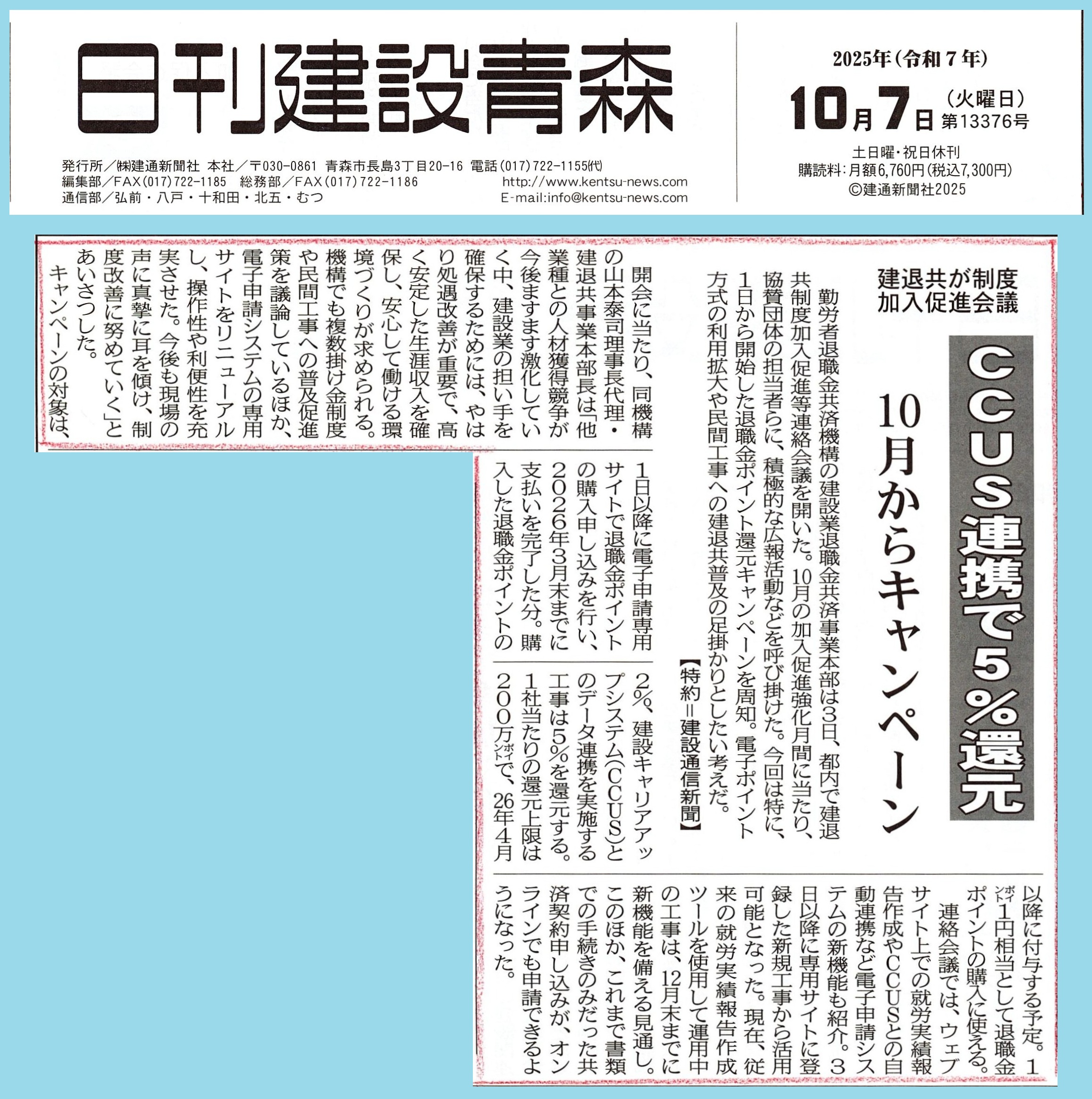 本日10月7日付 日刊建設青森様の記事で
