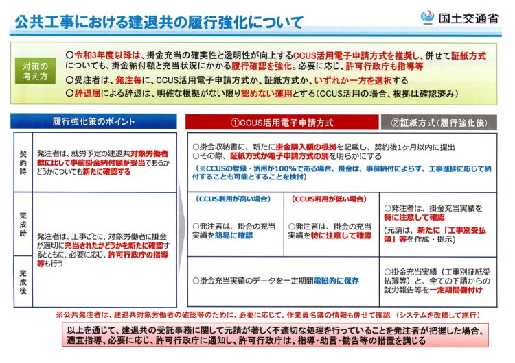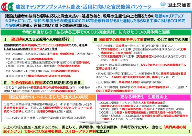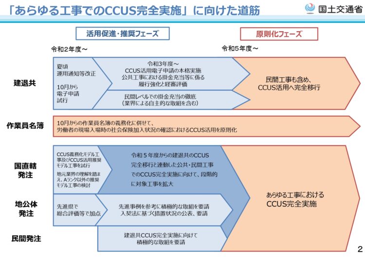 「あらゆる工事でのCCUS完全実施」に向けた具体策や道筋も示されており、令和5年(2023年)より、