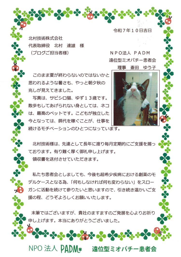 北村技術では遠位型ミオパチー患者会様に定期的な寄付を行っております