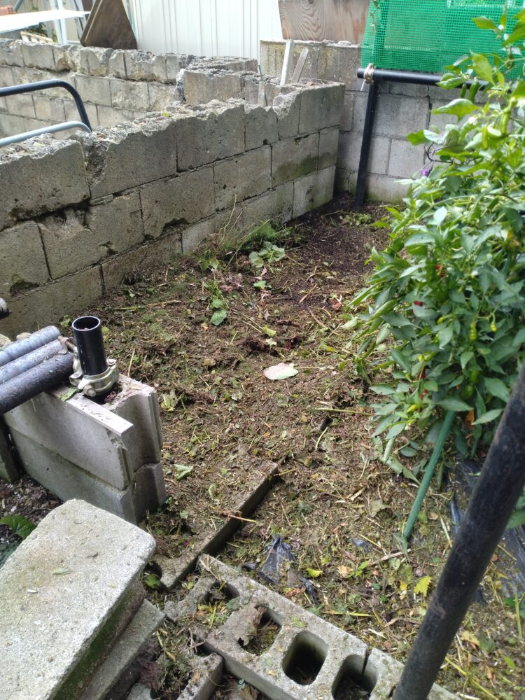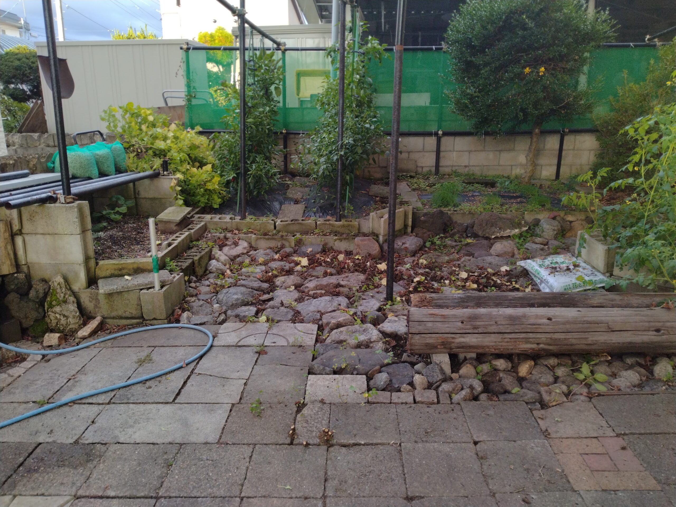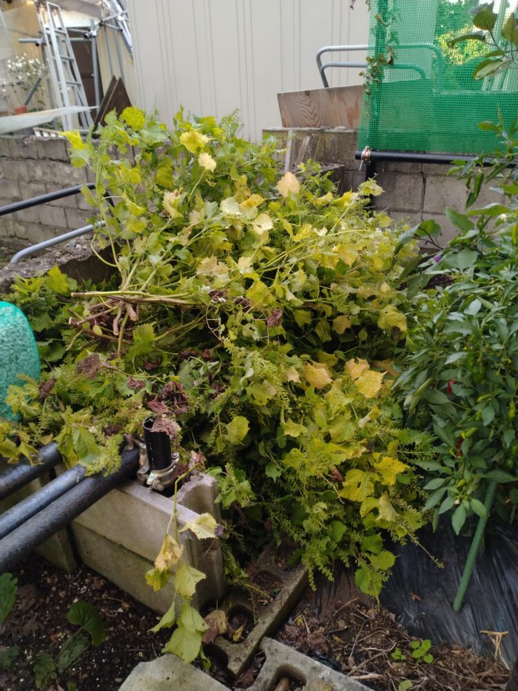 以前は草などは刈って(抜いて)ある程度揃えてそれを縛ってゴミに出してましたが、昨年までは細かく刻んで落葉+米糠と混ぜ込み庭にて処理していた。