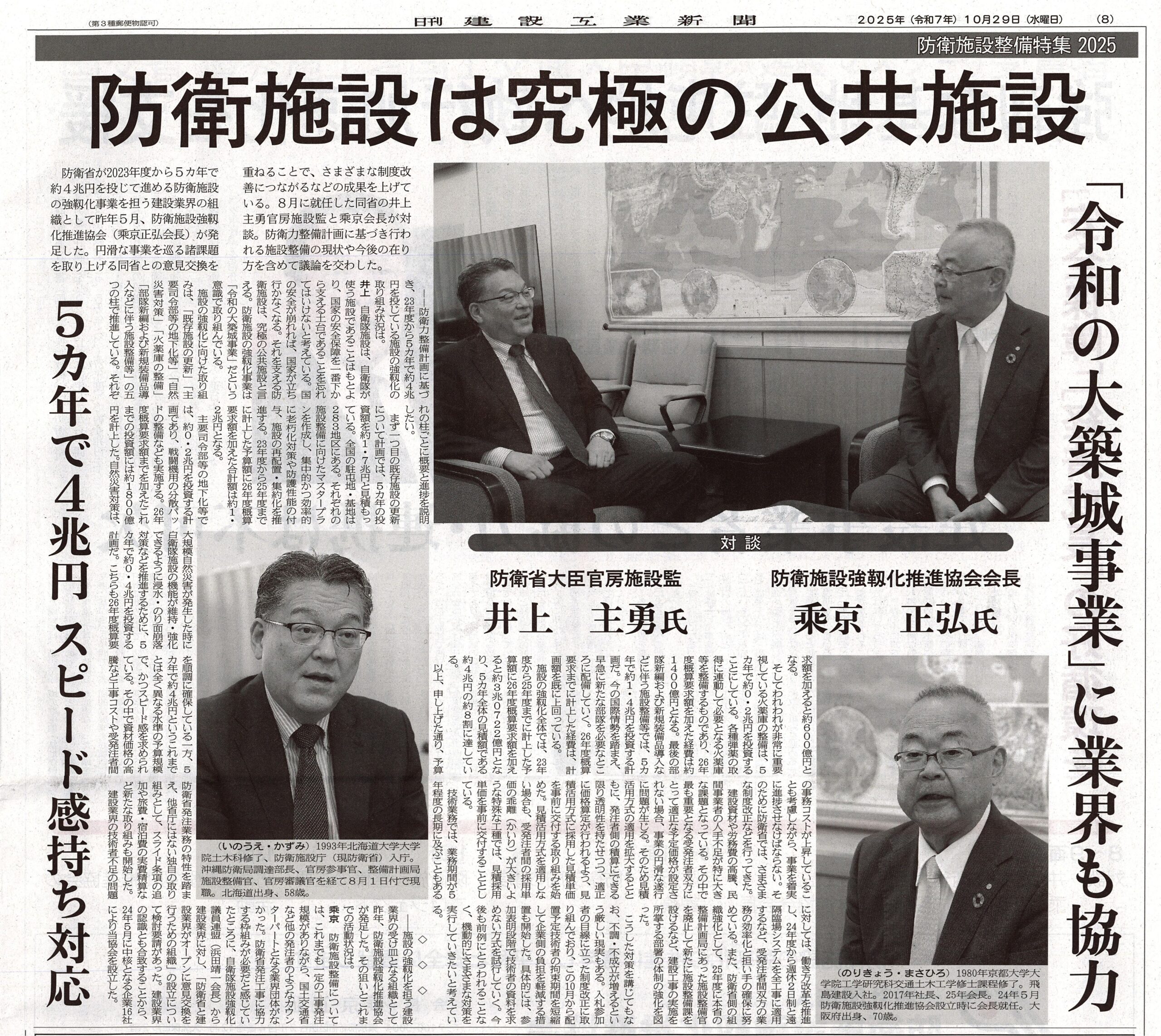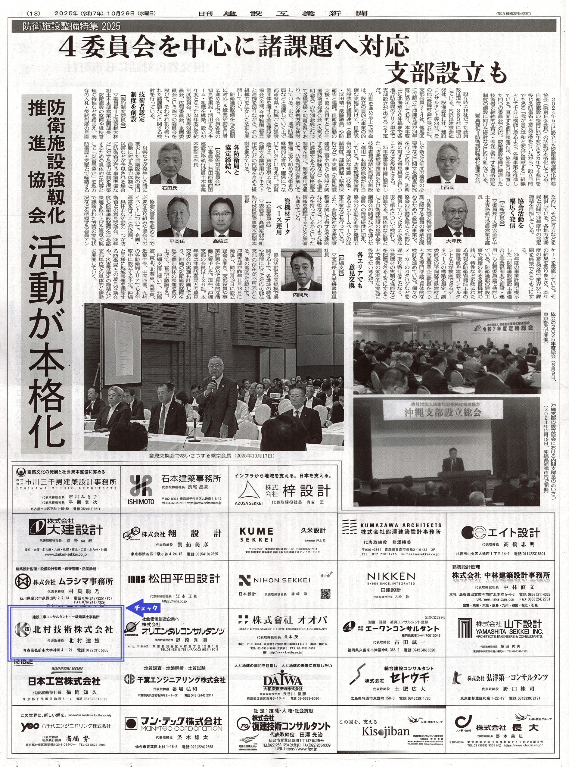 北村技術も一般社団法人(理事長飛乗京会乘京会長防衛施設強靭化推進協会)の一員として参加しています、今後もゼネコン会社のお手伝いできるように協力いたします、