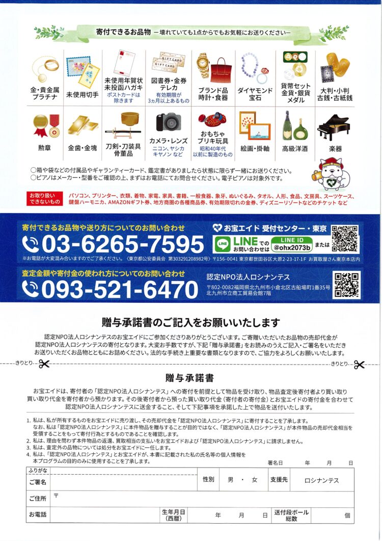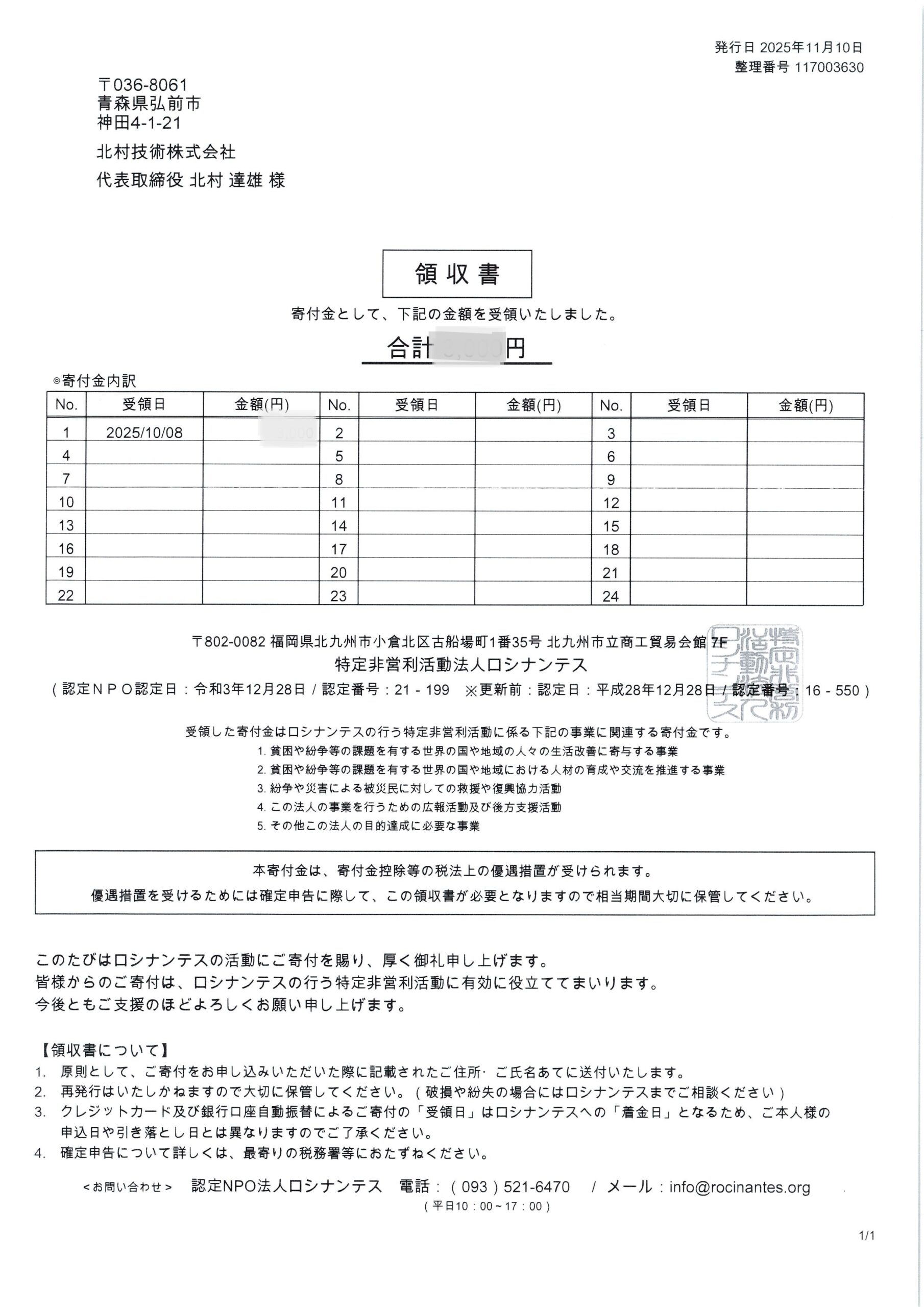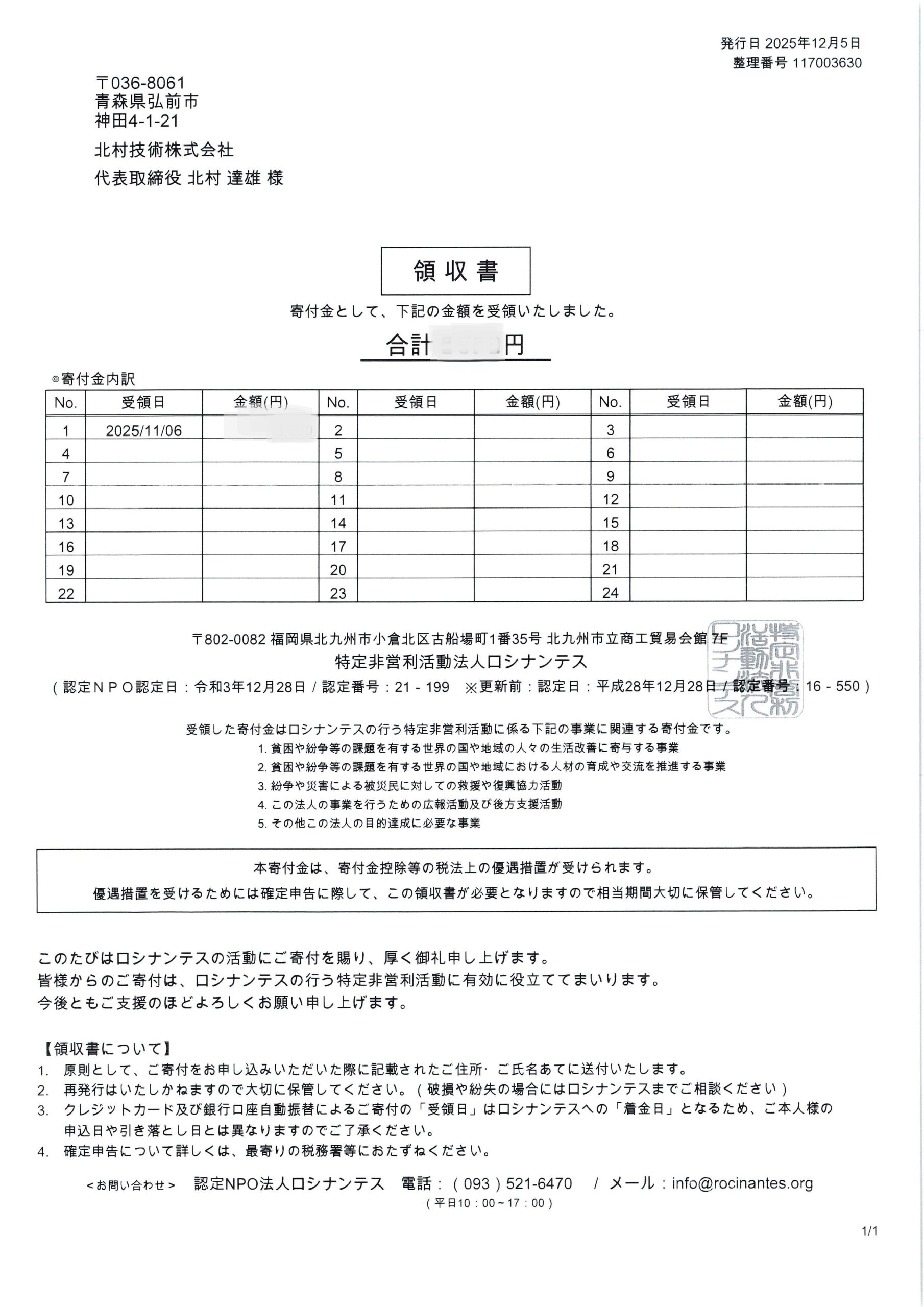 北村技術ではロシナンテス様に定期的な寄付を行っております