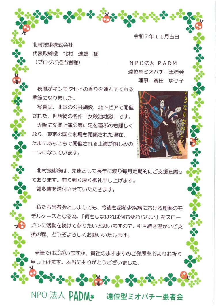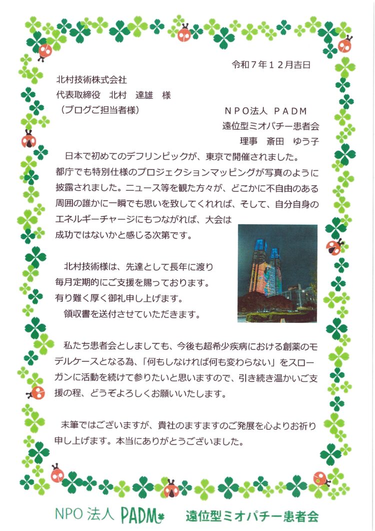 北村技術ではPADM遠位型ミオパチー患者会様に定期的な寄付を行っております