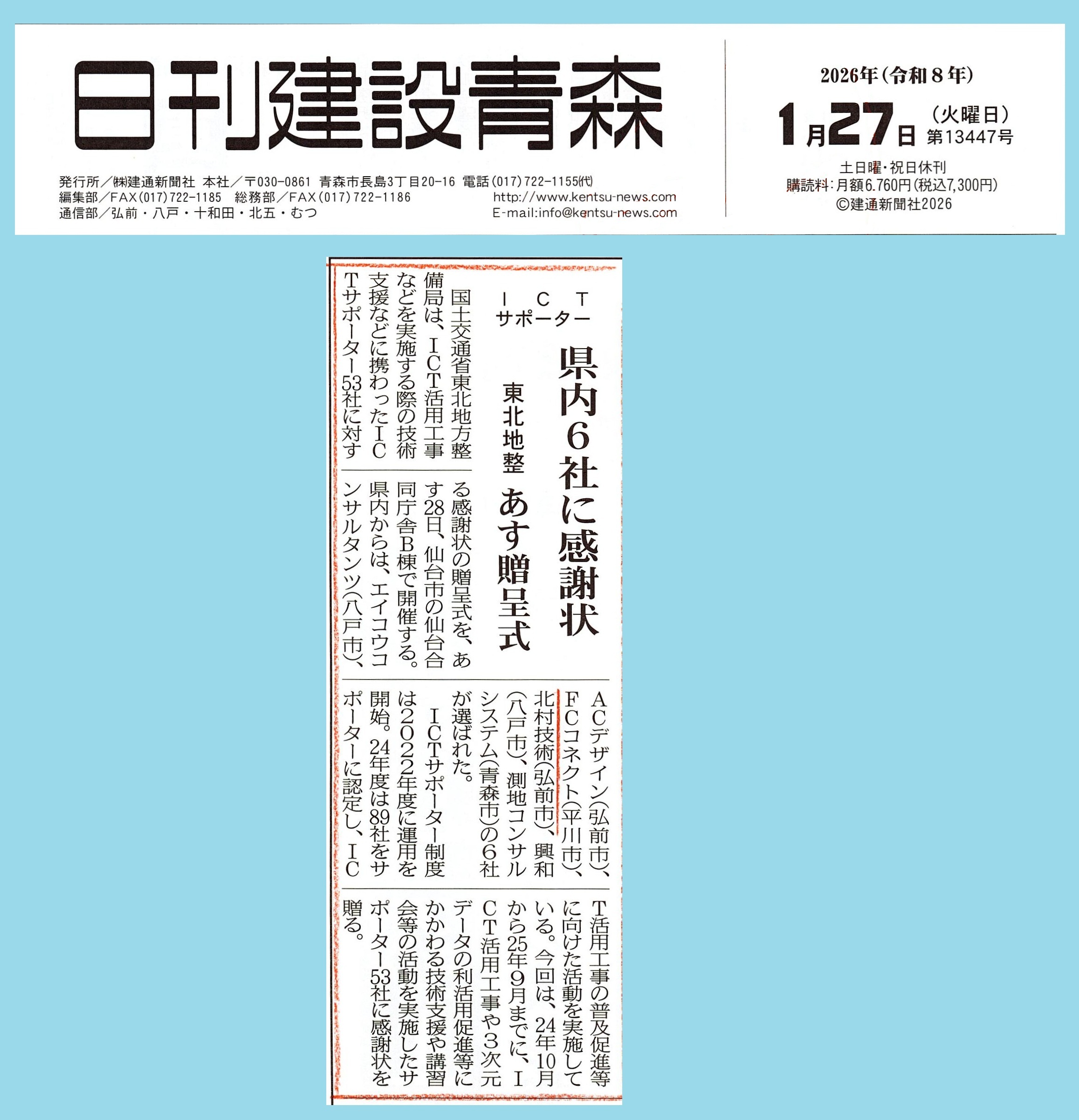 明日1月28日(水)、国土交通省東北地方整備局によるICTサポーター53社に対する感謝状の贈呈式が開催されます!