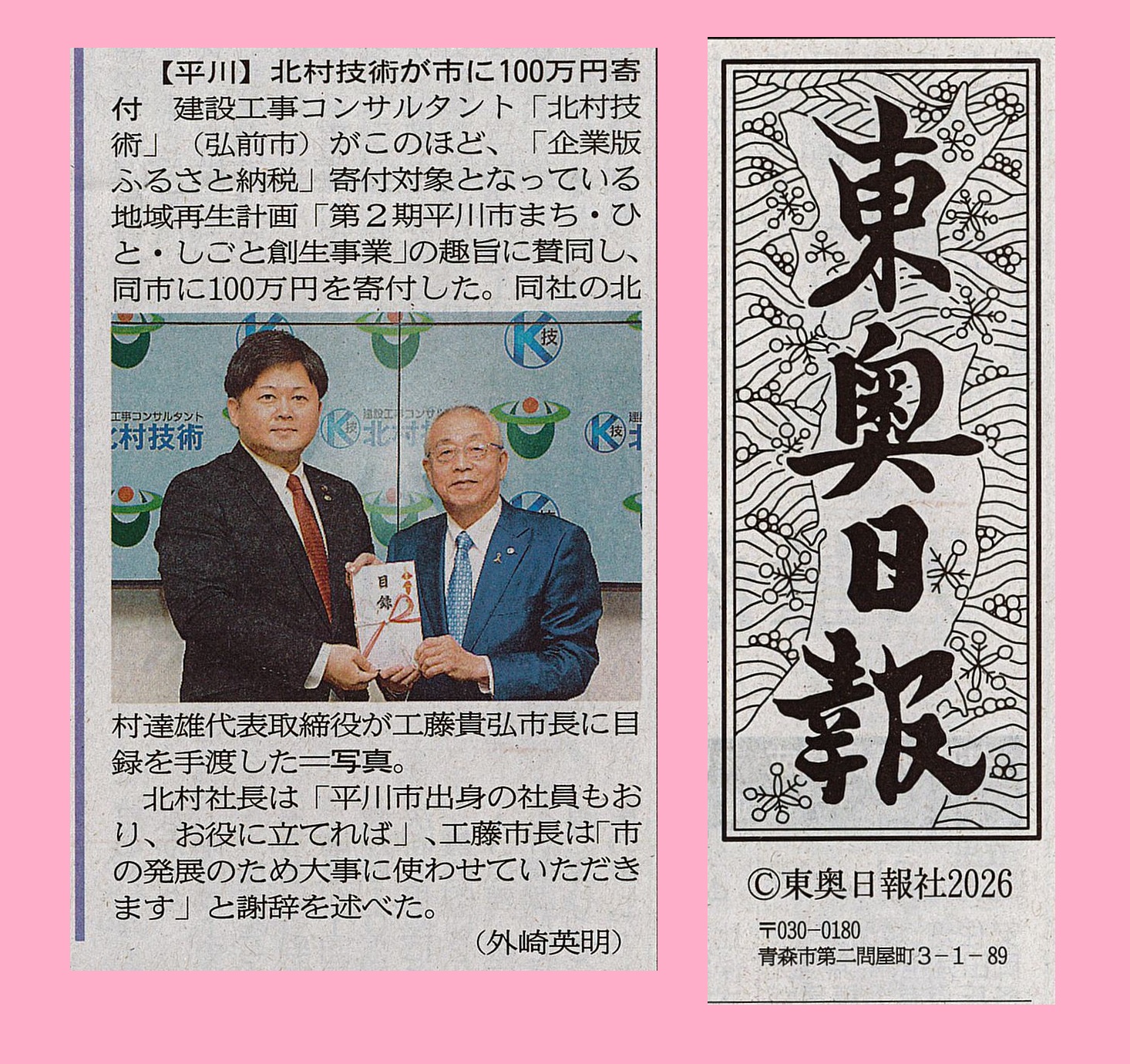 1月29日に平川市役所で行いました企業版ふるさと納税目録贈呈式の様子を建設新聞さんと日刊建設青森さんと陸奥新報さんと津軽新報さんと東奥日報さんに掲載頂きました📰✨✨