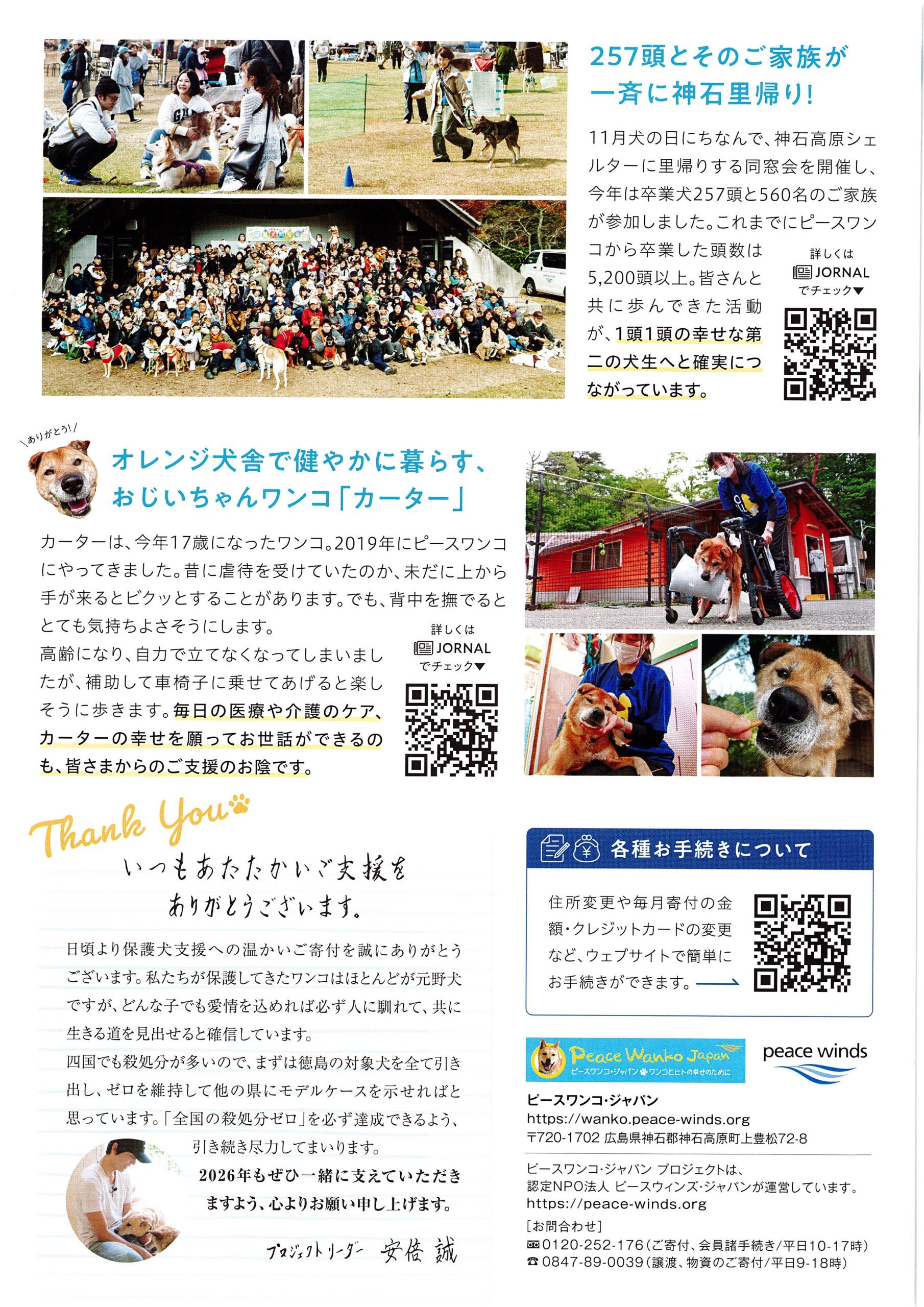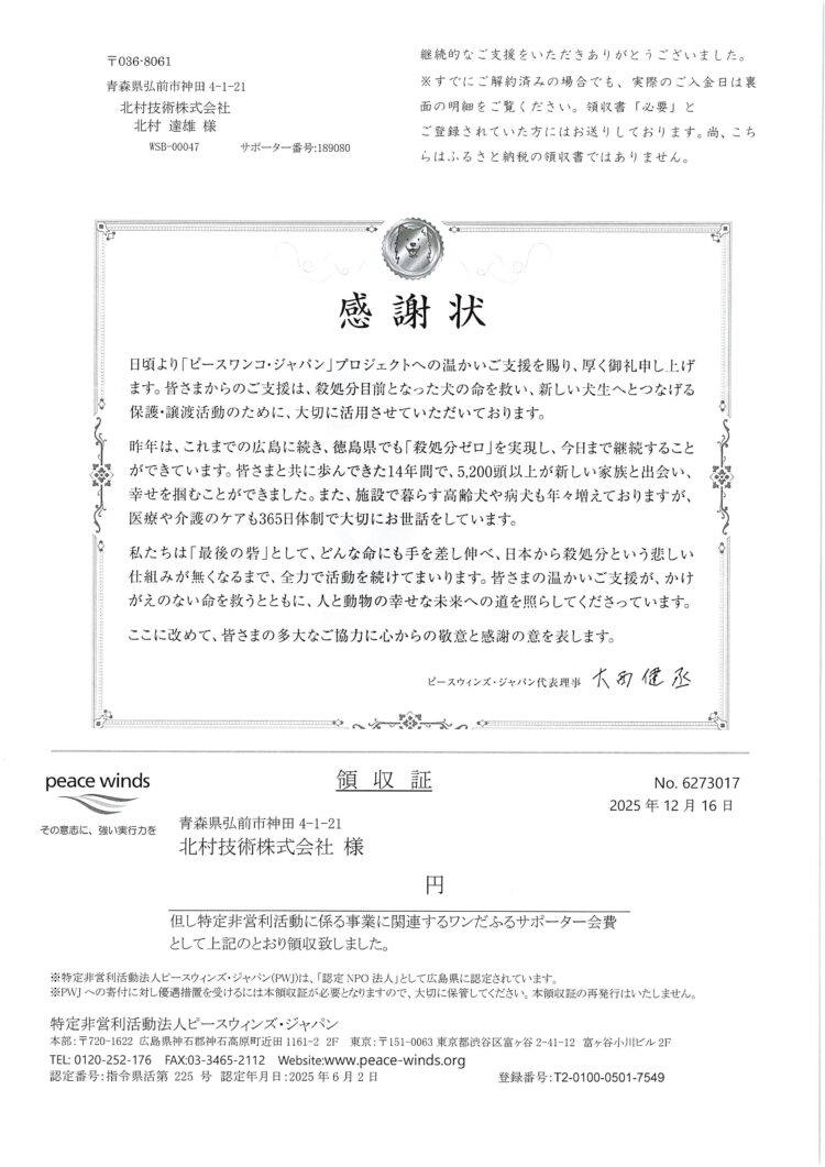 北村技術ではピースワンコジャパン様に定期的な寄付を行っております