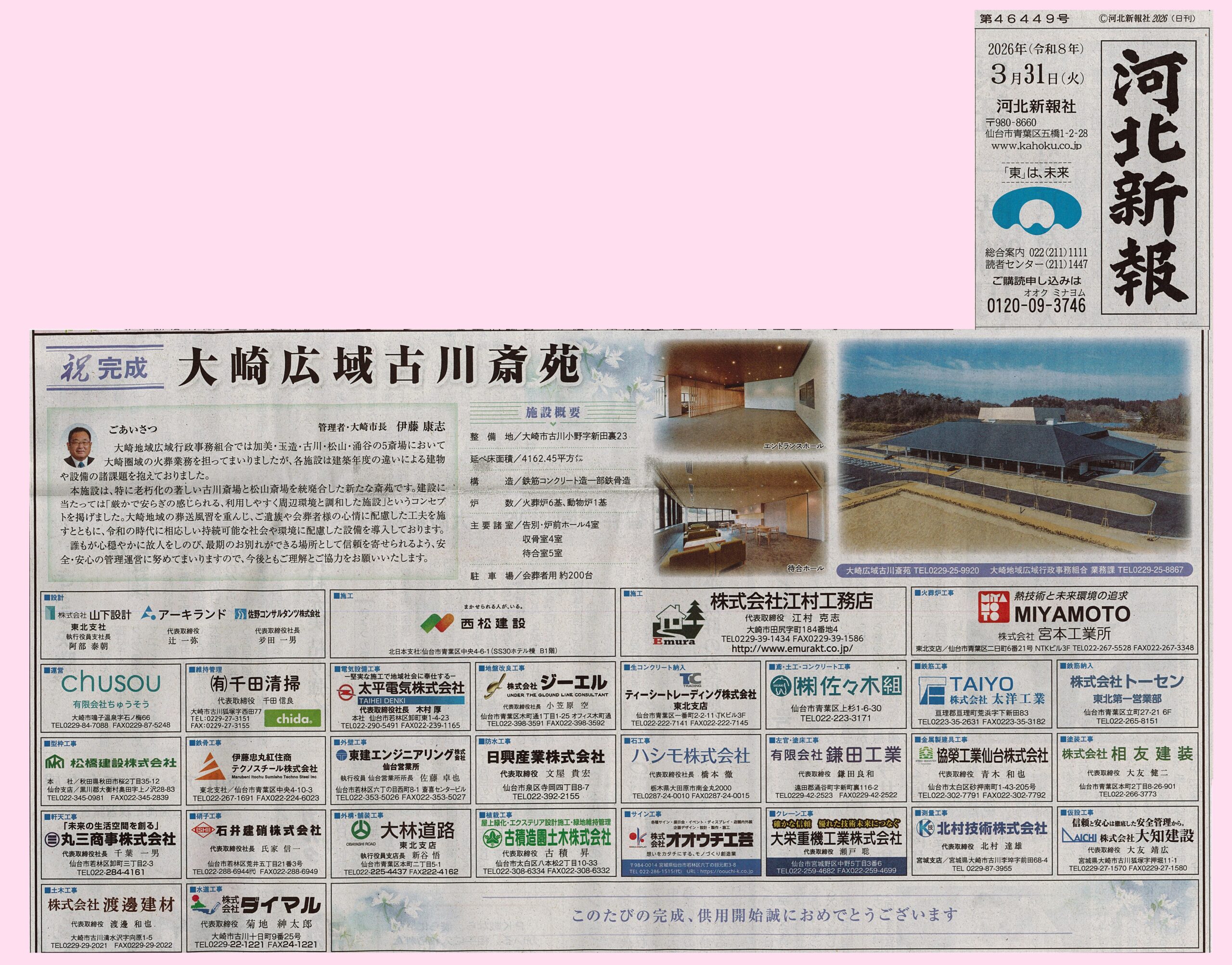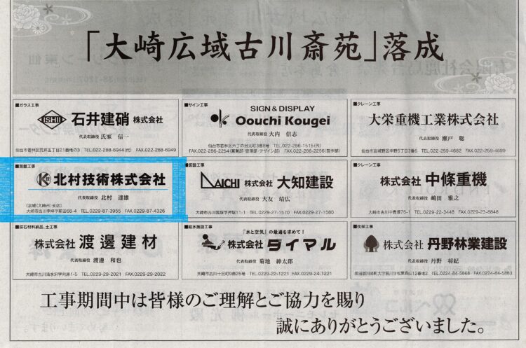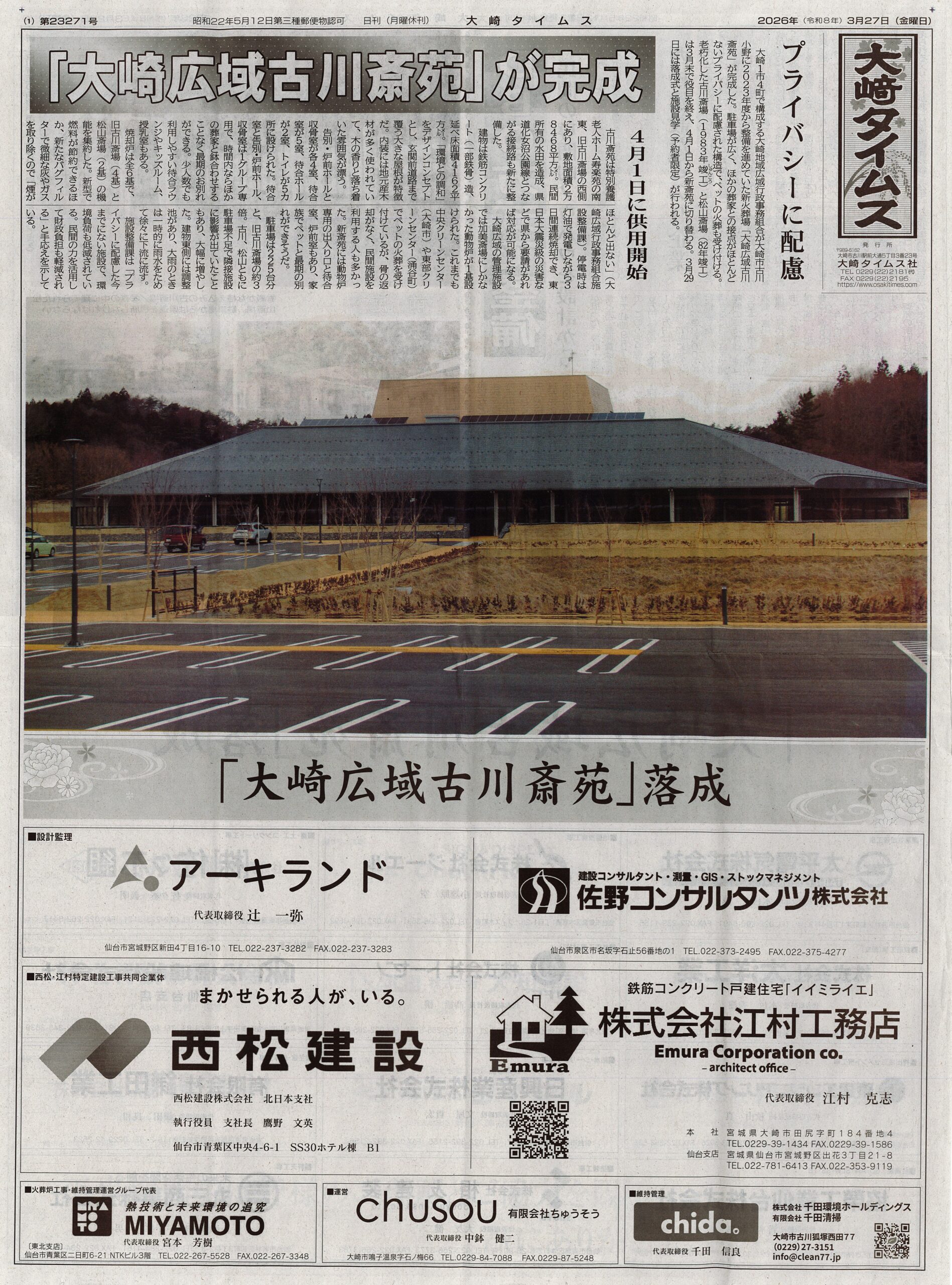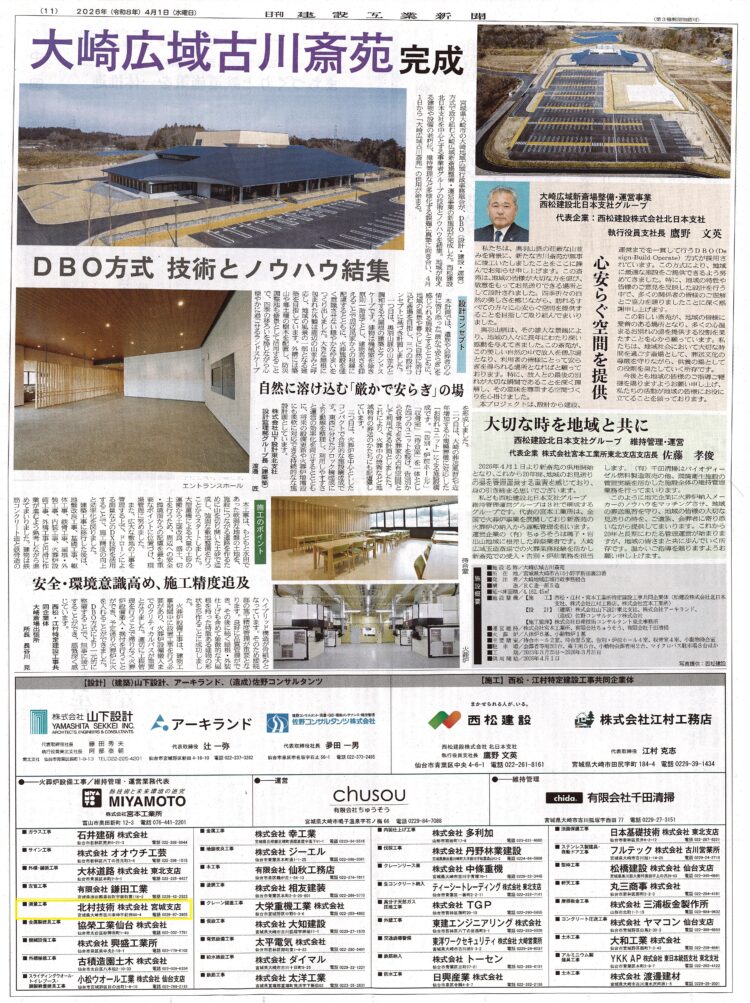 この度、大崎広域古川斎苑が完成し、4月1日より供用が始まりました。