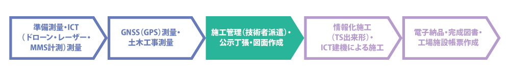 建設ICT(MC/MG)に対応した準備測量から工事丁張・3次元計測、TS出来形、図面作成、数量算出、電子納品、完成図書まで全ての工程に対応!もちろん、単体業務でも対応可能!