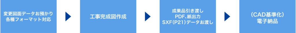 CAD製図基準に従った工事完成図の作成・納品が必要となります。 後工事の発注図への再利用、維持管理や日々の変更業務の中での再利用が目的となります。