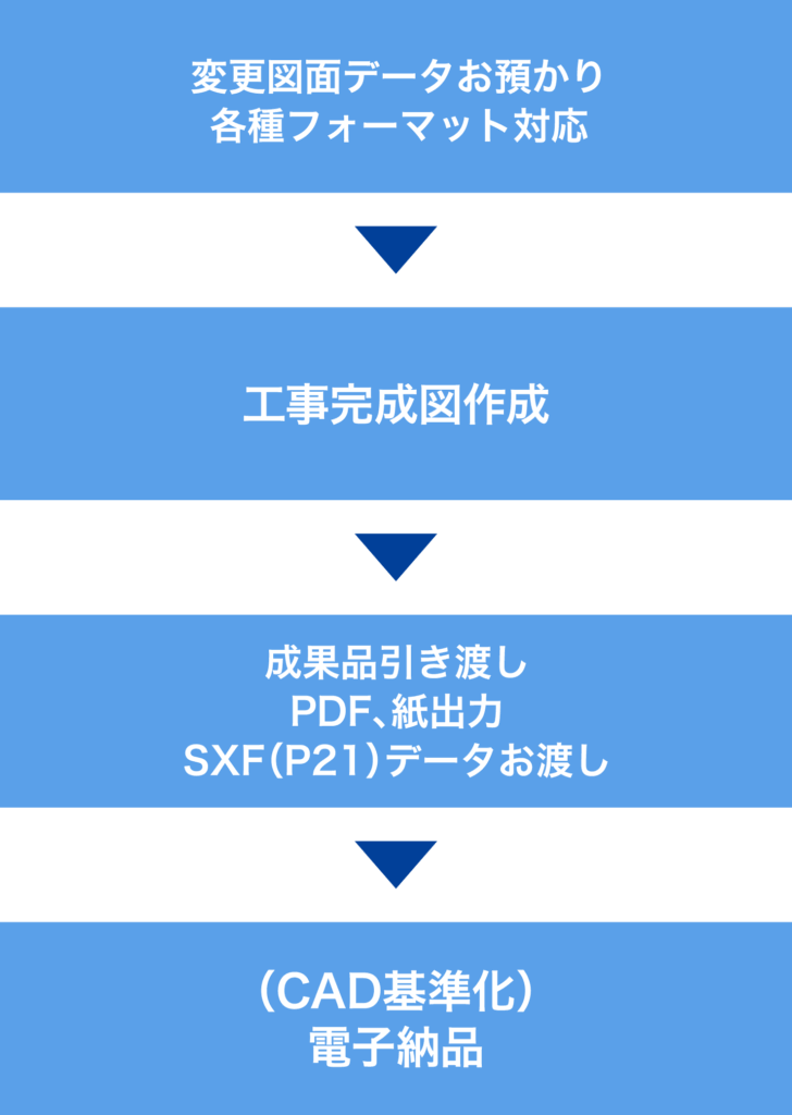 弊社では長年のノウハウを重ねた技術者が、CAD製図基準に従った変更図面の作成を迅速に支援することで、受注者・発注者間の協議や設計変更作業がスムーズに進むためのお手伝いをいたします。