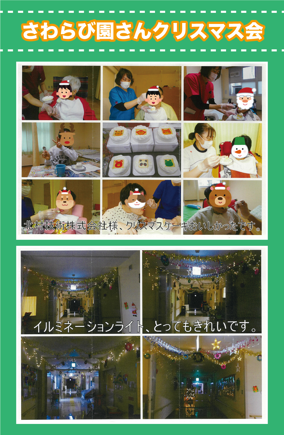 皆さんこんにちは😊 企画広報の鹿内です👩 雪がたくさん積もった次の日に晴れたり雨が降ったりする日が最近ありますが、そんな時は屋根の雪が落ちてくるので屋内に入る際は十分注意しましょう! もう去年になってしまいますが…さわらび園さんのクリスマスの様子が届きました~🎄... 続きを読む