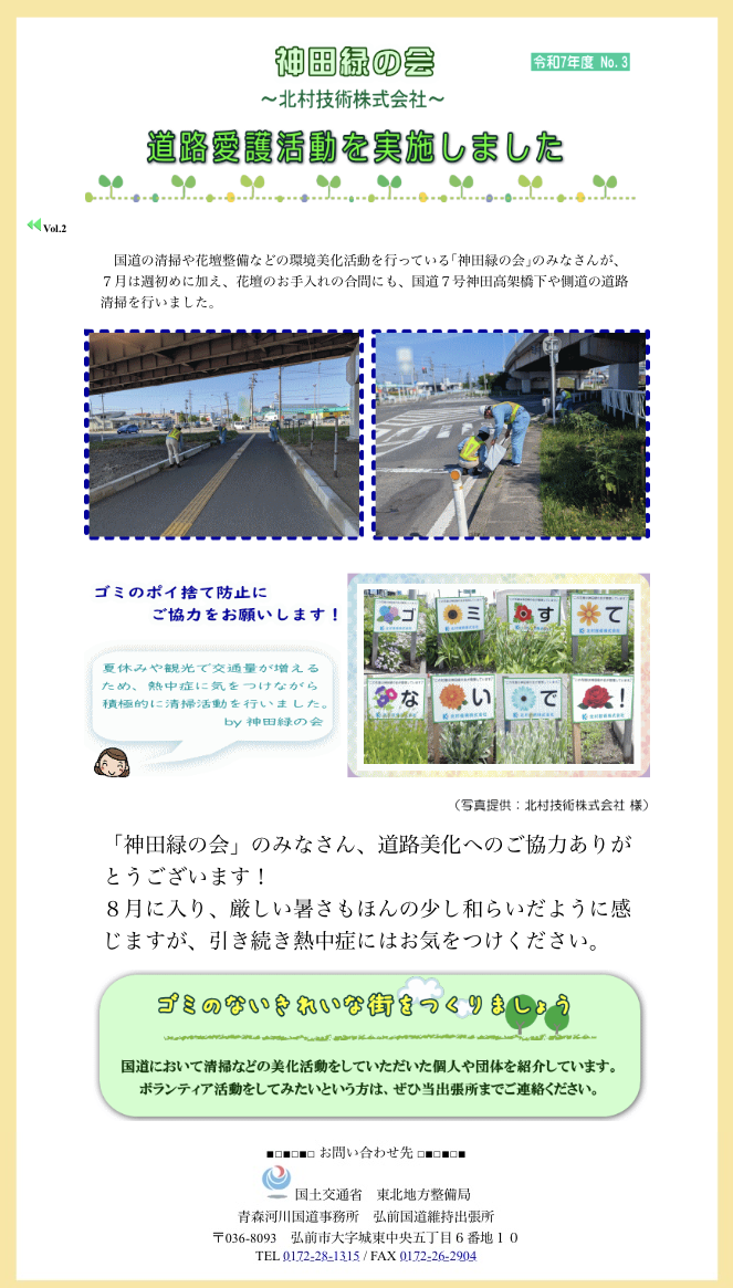 こんにちは 神田緑の会こと北村技術です😊 やーっと、朝晩と涼しくなってきて、弘前にも秋の足音が聞こえてきましたよ🍁今年の夏は特に暑くて暑くて💦そんな8月の活動が、11日、弘前国道維持出張所さんのホームページで紹介されました😊 ご紹介掲載いただきありがとうございます 8月は、... 続きを読む