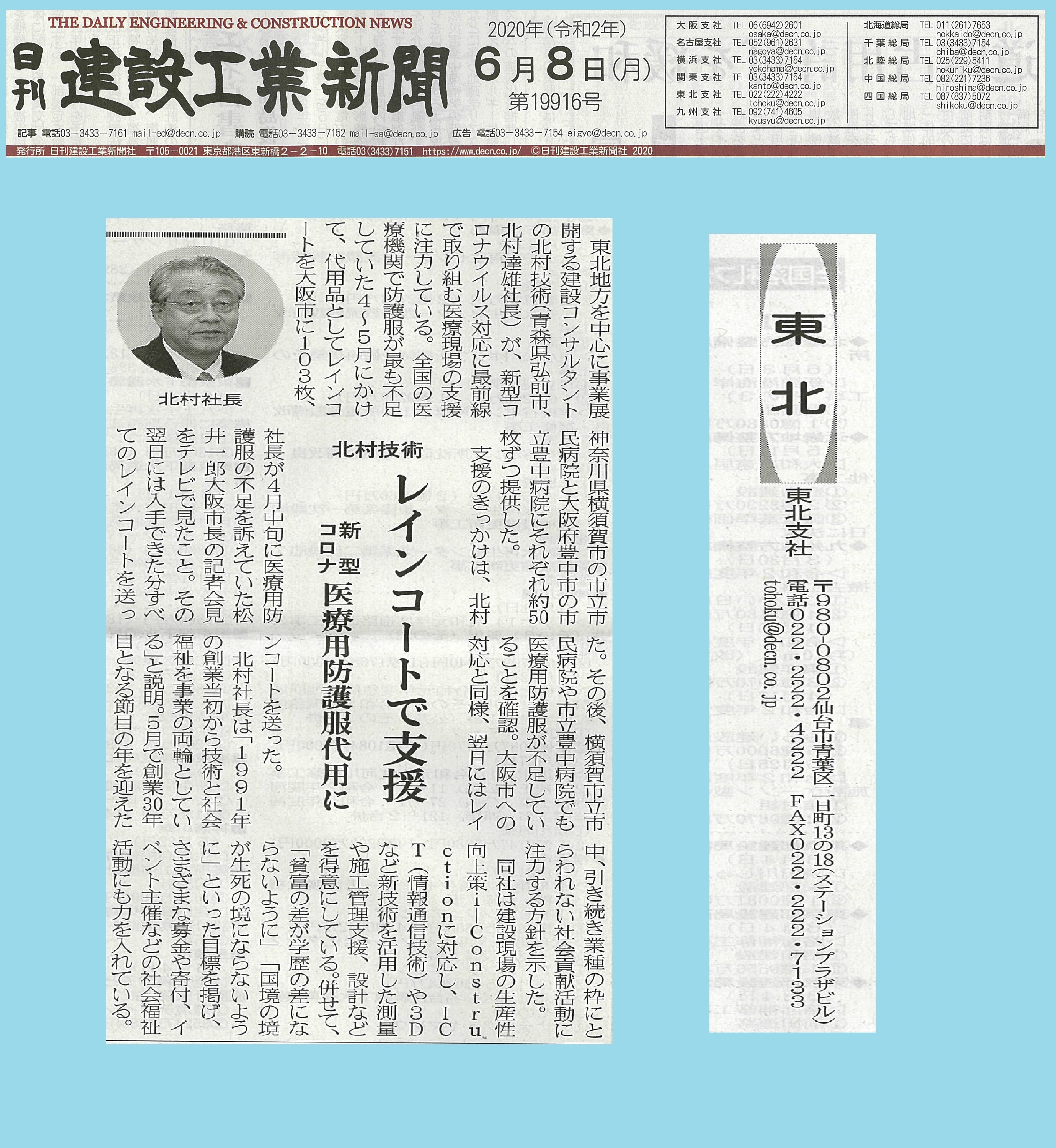 こんにちは、北村技術です! 弊社は先日、新型コロナウイルス感染防止のために、防護服が不足しているという情報を得て、代わりになる雨合羽レインコートを、 大阪市・横須賀市立市民病院・大阪の市立豊中病院へ送付させて 頂きました。 なんとその記事が、 建設産業専門誌・全国紙の日... 続きを読む