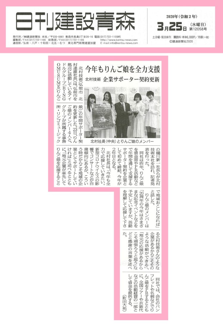 こんにちは(^O^) 北村技術に入社して二週間目になります総務の佐藤です。 北村技術は、2020年もりんご娘の年間サポーター契約を結びました。 3月23日にりんご娘さん達と写真を撮りました! 初めてお会いしたので感動しました(>_<) みなさん綺麗で... 続きを読む