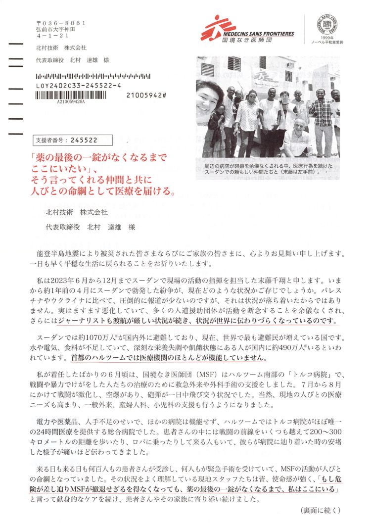 こんにちは。宮城支店です😊 今回ご紹介するのは国境なき医師団さんです。 厳しい状況にありながらも、人々の命を救うために活動されています。 国境なき医師団では現地で日本人スタッフの皆さんも奮闘されています。 当社では国境なき医師団様に定期的な寄... 続きを読む