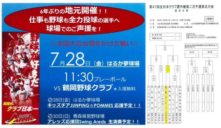 みなさんこんにちは🌞 毎日30℃近い日が続いています!熱中症に気を付けて野球観戦に行きませんか~~? 今月28~30日の3日間全日本クラブ選手権第二次予選東北大会に弘前アレッズさんが出場するそうです✨ まずは初戦28日はるか夢球場で11:30~VS鶴岡野球クラブさんと試合が... 続きを読む