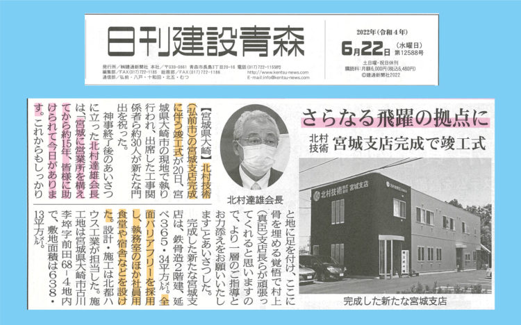 皆さんこんにちは(^^)/ 企画広報の鹿内です👩 北村技術宮城支店竣工式の様子を日刊建設青森様に掲載していただきました✨ ありがとうございます! 竣工式当日は約30人の方が出席してくださいました👷 北村会長は 「宮城に営業所を構えてから15年、... 続きを読む