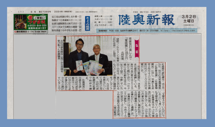 こんにちは⛄北村技術です。 先日の弘前愛成園さんへの卒園旅行寄付金贈呈式の様子が"陸奥新報さん"に掲載になりました👀どうぞご覧ください ↓ ↓ ↓ 卒園旅行のプレゼントは今回で7回目。 コロナウイルスの影響で3年?4年?ほど中断していましたが、今年は解禁... 続きを読む
