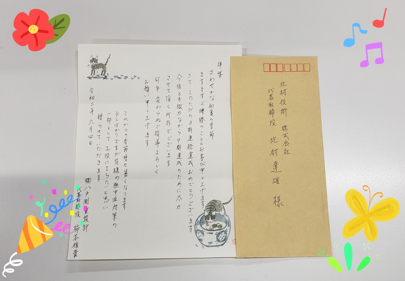 皆さんこんにちは、北村技術です♪ 本日、八戸測量設計さんより測量業者の8連覇のお祝いと 熱中症対策として飲み物が沢山届きました! ありがとうございます???? お手紙も頂きました(*'▽') 社長の好きな猫の便箋でした???? ... 続きを読む
