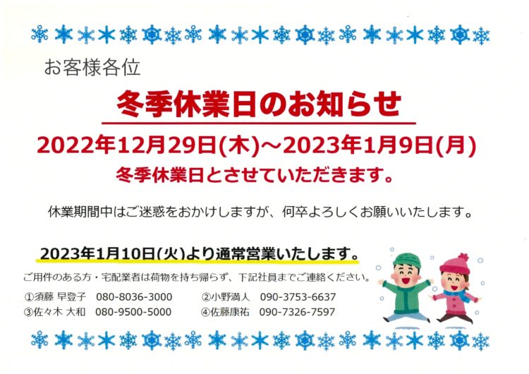 みなさんこんにちは❄ 冬季休業のお知らせです~!! ↓↓↓ 弊社では 2022年12月29日(木)~2023年1月9日(月) までお休みをいただきます<m (__) m>よろしくお願いいたします。 1月10日からは通常営業を致します... 続きを読む