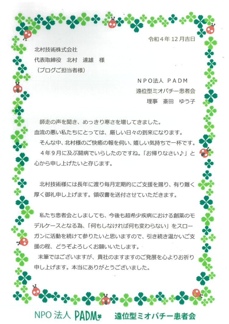 みなさんこんにちは😊 企画広報の鹿内です👩 北村技術では遠位型ミオパチー患者会さんへ定期的な寄付をおこなっております🍀 そしていつもブログを見ていただきありがとうございます(^^♪ 寒くなりミオパチー患者さんも厳しい日々を過ごされているそう... 続きを読む