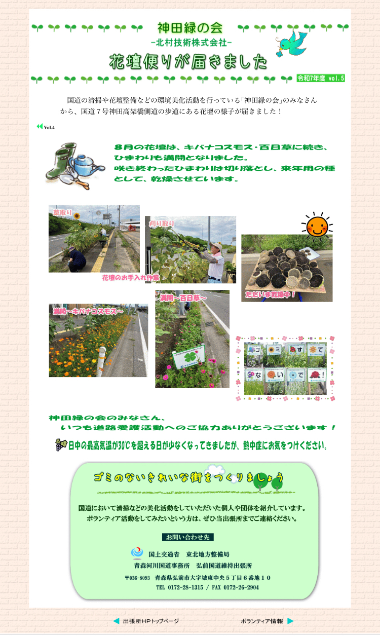 こんにちは 神田緑の会こと北村技術です😊 やーっと、朝晩と涼しくなってきて、弘前にも秋の足音が聞こえてきましたよ🍁今年の夏は特に暑くて暑くて💦そんな8月の活動が、11日、弘前国道維持出張所さんのホームページで紹介されました😊 ご紹介掲載いただきありがとうございます 8月は、... 続きを読む