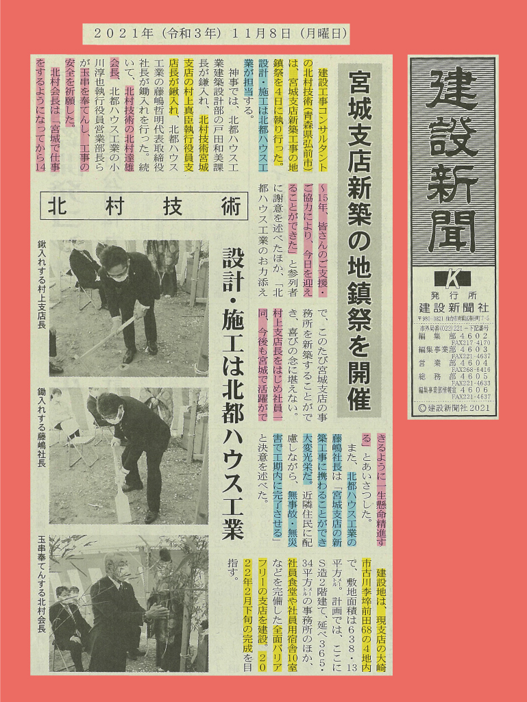 こんにちは😊 企画広報の鹿内です👩 先日の地鎮祭の様子を新聞に掲載していただきました!!! 建設新聞様、みやぎ建設新聞様ありがとうございます✨ 記事をピックアップしてお伝えします🌼 新聞記事には鍬入れをする村上支店長の様子が掲載されて... 続きを読む