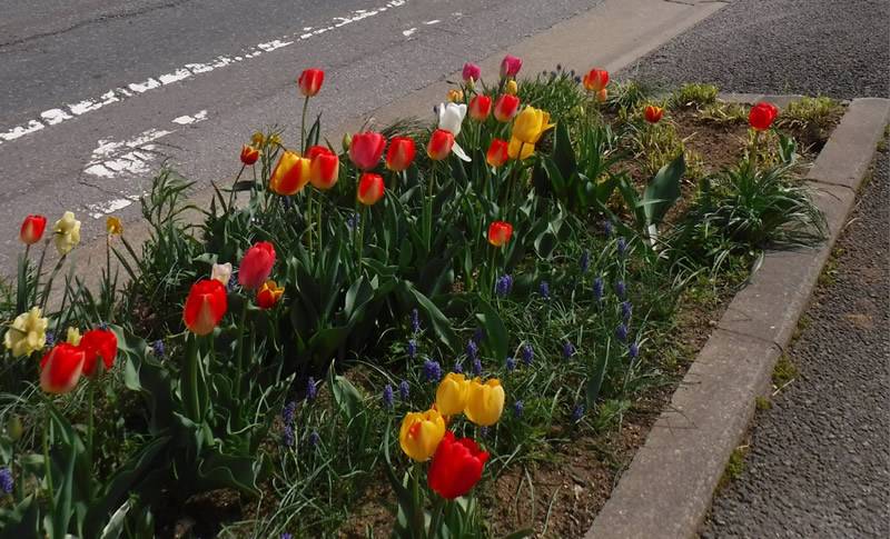 春はチューリップ、すずらん、水仙、バラなどが咲き誇り、夏にはひまわり、ラベンダー、マリーゴールドが香り高く咲きます。そして秋には百日草、コスモスの美しい花が道を彩ります。四季折々の花が、年間を通して彩り続けています。