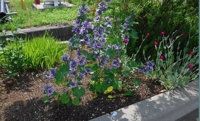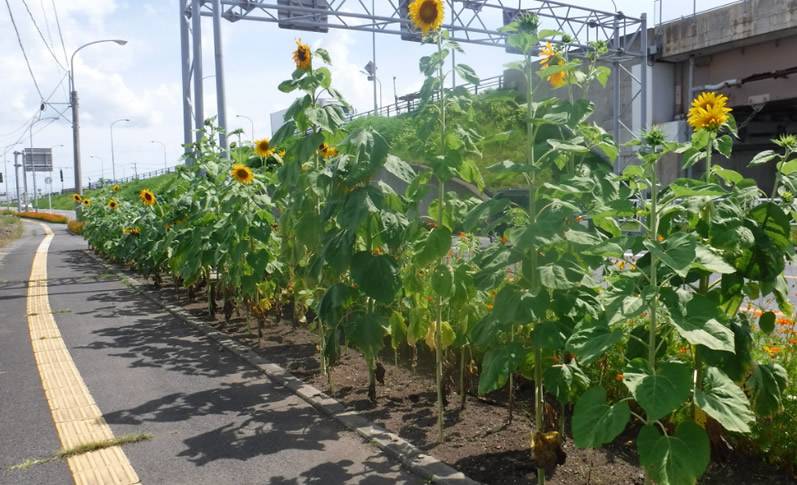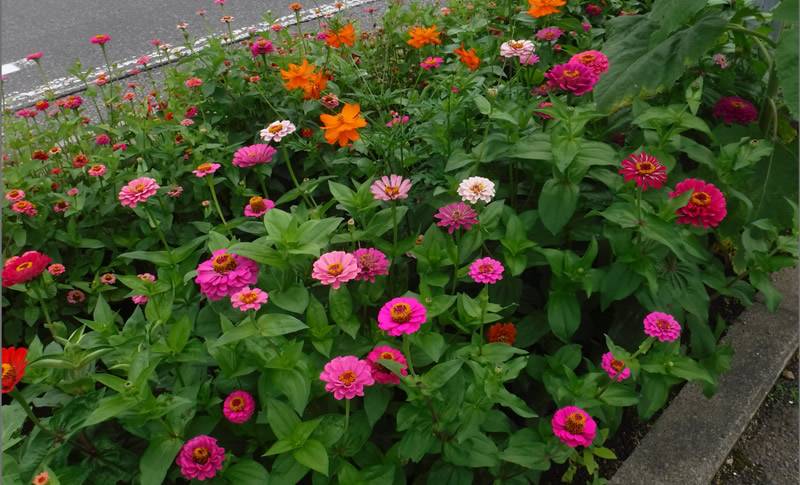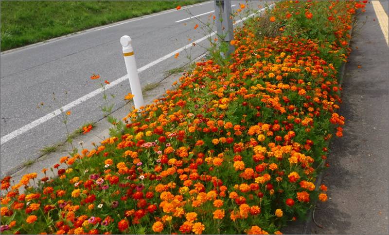 北村技術本社前の国道7号線沿いの約300mにわたる歩道の花壇を、春から秋まで一年を通じて美しい花で彩っています。